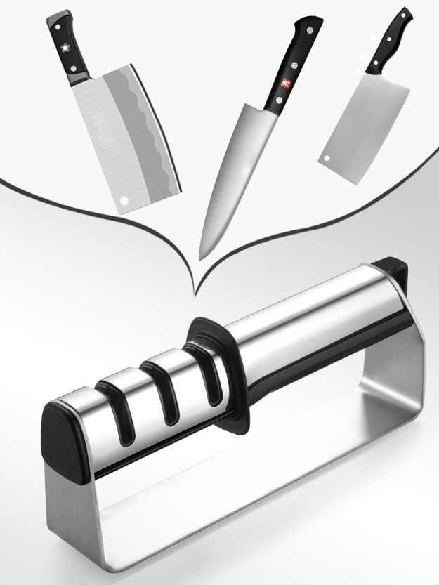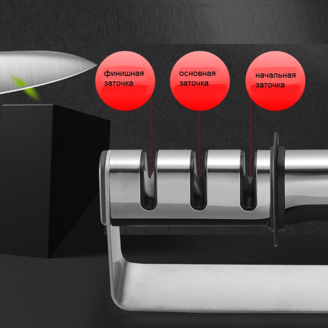 Акуратна компактна та високоякісна стругачка для двох типів ножів: металевих із гладкими лезами та керамічних. Для того, щоб заточити ніж, поставте точило гумовими подушечками на гладку поверхню, наприклад, стіл. Притримуючи однією рукою точило, іншою рукою проведіть лезом ножа по заточувальних елементах точила, як зображено на фотографії. Рухи необхідно здійснювати з легким натисканням ножа в напрямку від ручки до кінчика леза.На точилці є три типи заточувальних елементів: твердосплавні пластини (carbide), стрижні з алмазним напиленням (diamond) та керамічні стрижні (ceramic). Сильно затуплені ножі необхідно заточувати на твердих пластинах. Алмазні та керамічні заточувальні елементи передзначені для доведення і шліфування різальної крайки ножа. |
