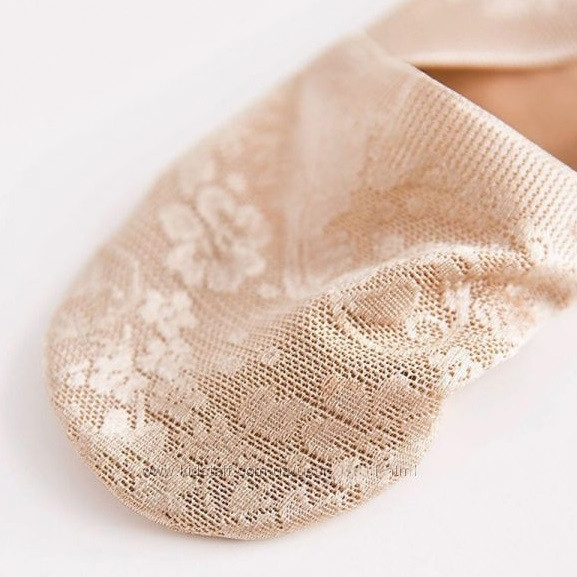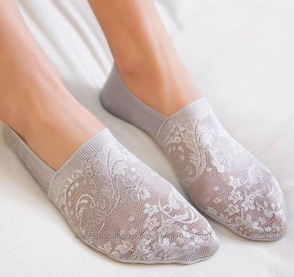 Жіночі мереживні підслідники з гладким бавовняним низом. Мають силіконовий ремінець на внутрішній поверхні, який дає щільно прилягати до ноги. Підошва з бавовняної тканини, є силіконовим покриттям, яке забезпечує ефект антиковзання. Зручні, еластичні, добре тримаються на нозі. |