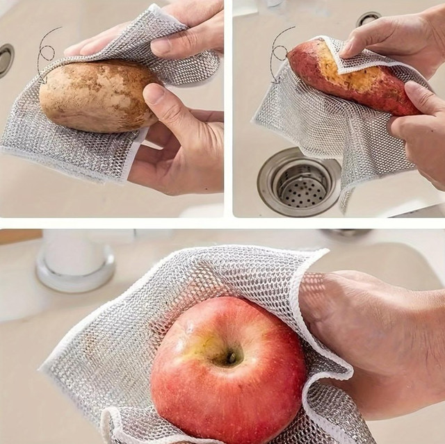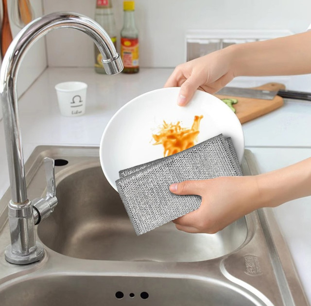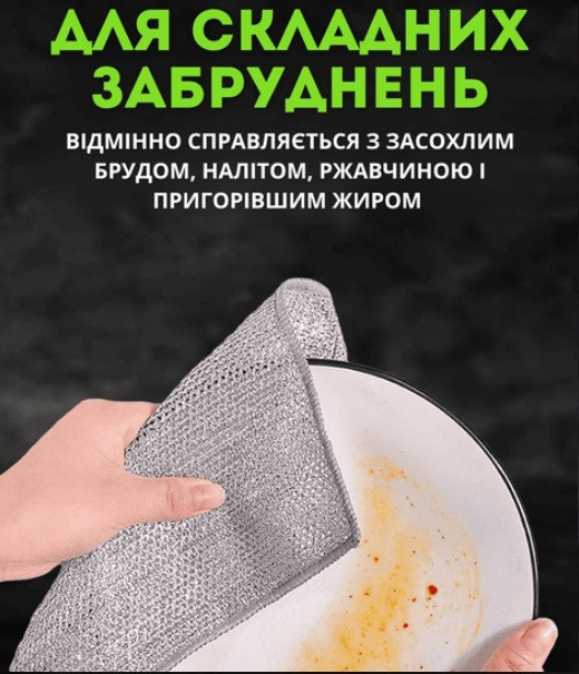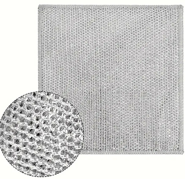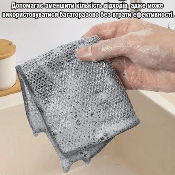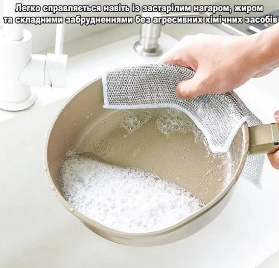 Серветка для миття посуду з міцного поліестеру з металічним блиском — практичне рішення для щоденного догляду за кухонним начинням. Ефективно видаляє жир, залишки їжі та забруднення, не дряпаючи поверхню. Підходить для каструль, сковорідок, плит, раковин і столового приладдя. Швидко сохне, не вбирає запахи та зберігає форму навіть після багаторазового використання.
