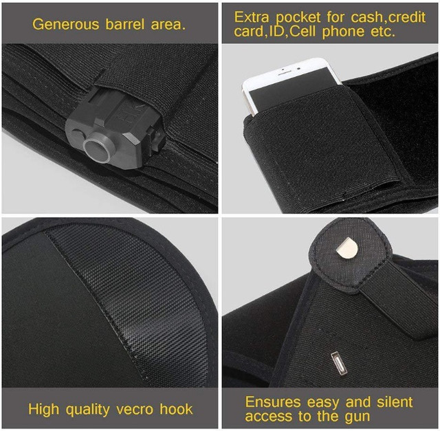 - Надійна фіксація. Незалежно від розміру пістолета, його можна зафіксувати в нерухомому положенні завдяки наявності на внутрішній стороні пояса-кобура універсальною регульованою спеціальних еластичних кишень і фіксатора, а в сусідній кишені обойму. Можлива фіксація зброї в декількох положеннях, залежно від того, необхідний бійцеві максимально швидкий доступ до зброї, або він бажає забезпечити максимально безпечне транспортування пістолета під час переміщення в умовах перетяної місцевості;